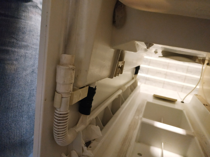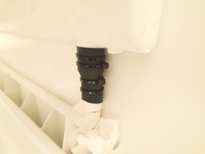 Слева видна трубочка, по которой можно отследить уровень воды. И, отстегнув её, можно слить воду из бачка, чтобы зимой не замёрзла и/или в ней жизнь не зародилась. Судя по черному налёту, жизнь там зародилась...