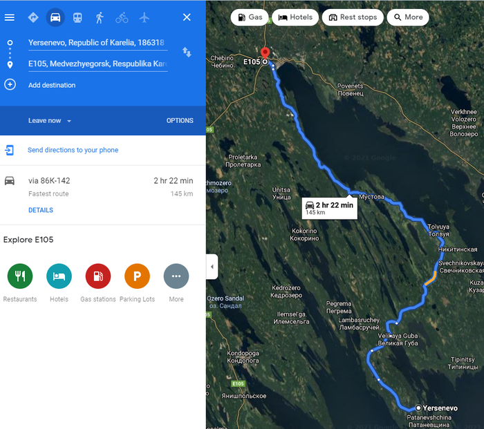 Точка старта к Кижам - Медвежегорск. Гугль особо не разбираясь прокладывает дорогу по каким-то дорогам, а что будет на месте - одним Росавтодорцам ведомо. По факту оказалось 10% километров стрёмной грунтовки с ремонтами, 40% старого асфальта с ямами, 50% нового асфальта, причем в неожиданном месте - где я совсем не ожидал увидеть новую дорогу, так это на последних 40 километрах. А она там была.