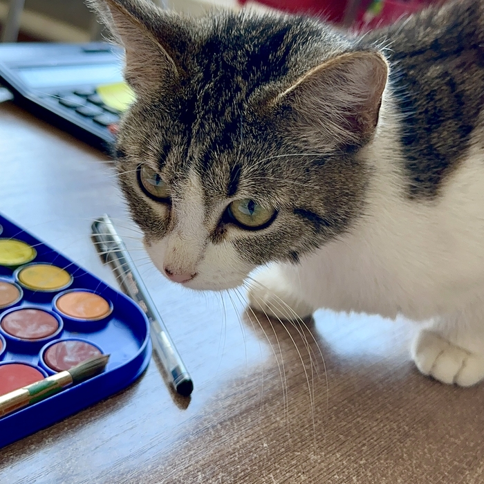 Живет у нас в магазине котейка. Немного пугливая, редко дает себя погладить. Но всё меняется, когда сажусь рисовать 😄 Может, в прошлой жизни она тоже была художником?!🤔🤗