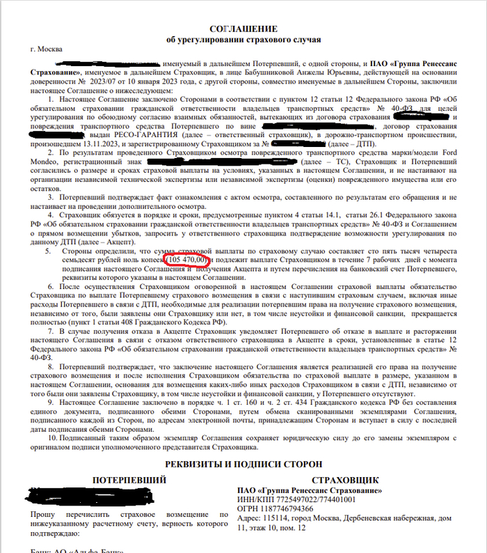 Сумма вполне приемлемая с учетом того, что износ у автомобиля все же есть, да я заплачу больше. Но это явно не исходные 11 или 12 тысяч рублей. После подписания мной соглашения, прилетела вторая сумма.