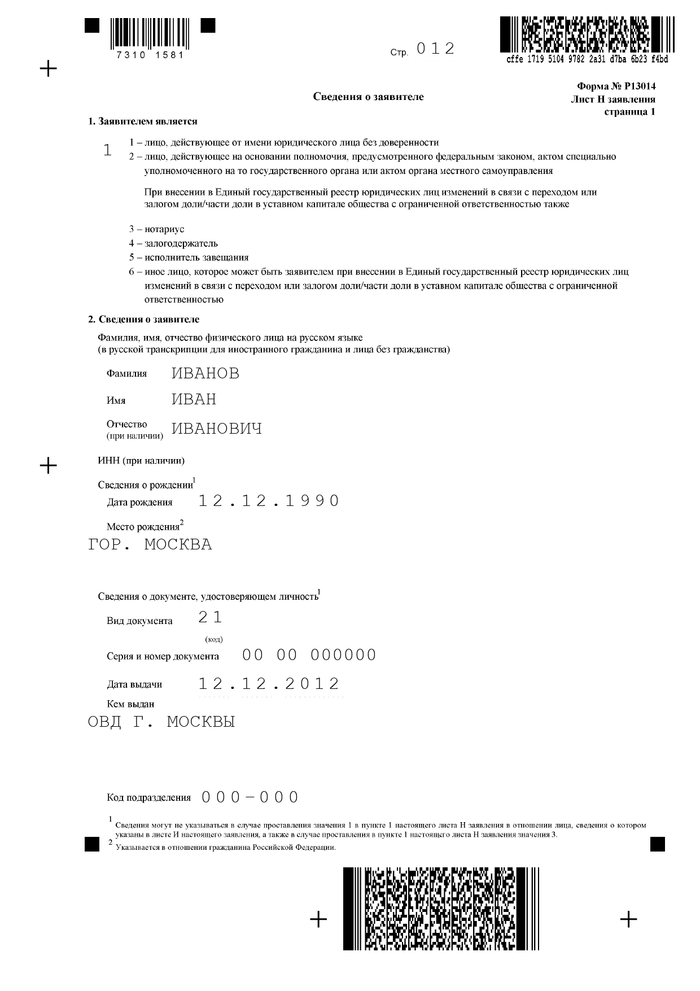 В нашем случае заявление подаёт генеральный директор, поэтому в пункте «Заявителем является» проставляем цифру 1, а в пункте 2 снова указываем паспортные данные генерального директора.