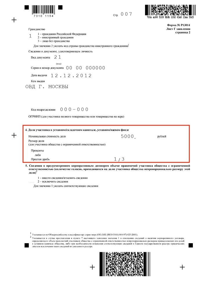 Если у прежнего учредителя изменилась доля в уставном капитале или надо указать, какая доля принадлежит новому учредителю, продолжаем заполнять лист Г. Указываем долю в процентах или дробью.