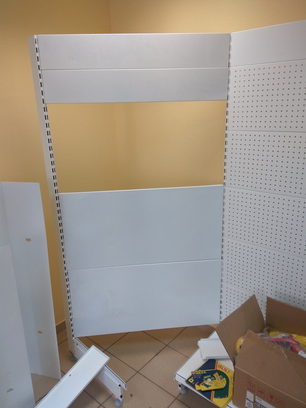 Тут тоже был косяк. 2 стенда в итоге не поместилось на свои места. Один из-за того, что я забыл про дверь, другой просто не влез на 6 сантиметров, я не проследил. Но это не беда, переставили немного иначе, получилось не хуже. По расстановке планировалась выставочная зона(Справа внизу на схеме), где будут находиться информационные стенды с крепежом, далее витринами отделяется зона продавца(слева внизу на схеме) и склад со стеллажами в комнате. На складе стеллажи обычные, в торговой комнате перфорированные, чтобы можно было повесить крючки, как на фото только еще с полками.