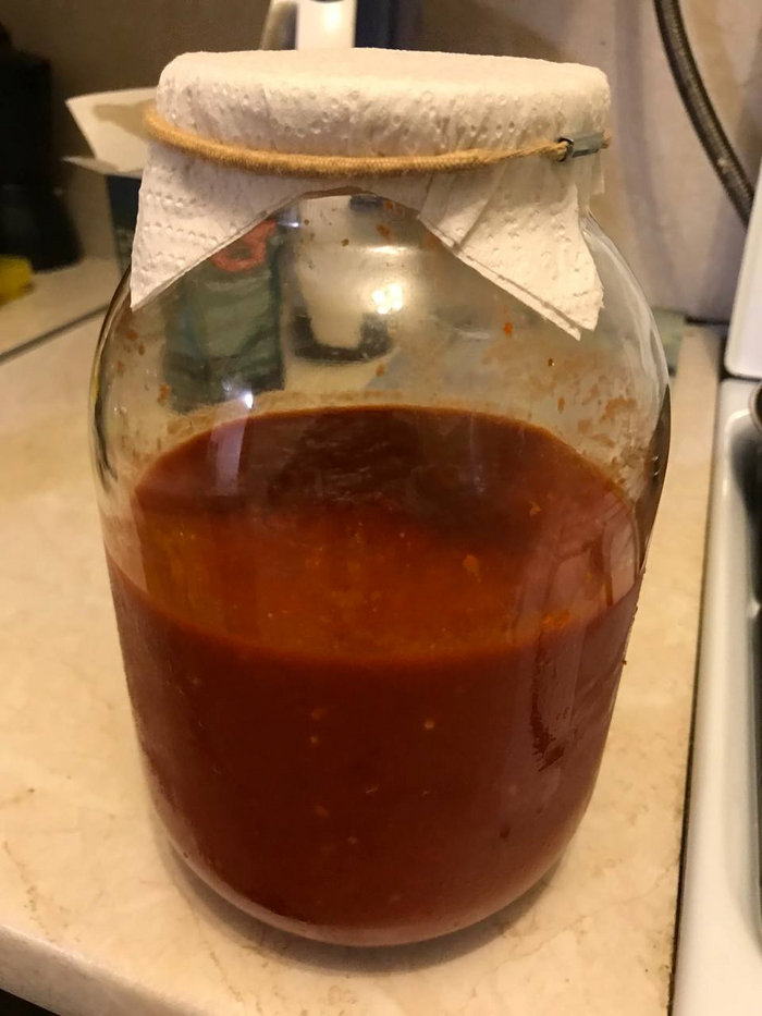 Ставим в тёплое и тёмное место нашу банку и начинаем каждые полчаса на неё смотреть. Спустя неделю появились первые изменения: запах сменился с резко адски перцового на приятный и кисловатый, в самой банке появилось много пузырей углекислого газа.