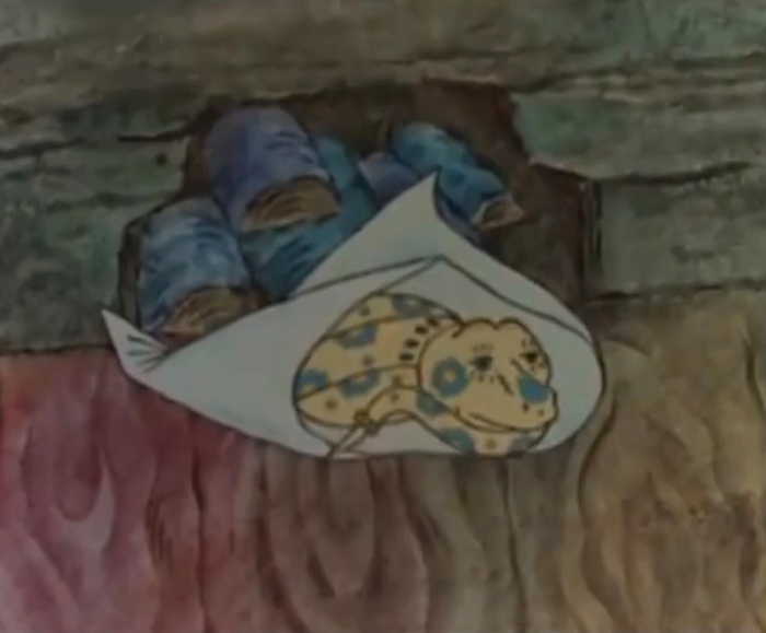 Ключевой момент мультика - разумная змея, подарившая добру молодцу необычную бижутерию. С помощью чудо-кольца парень строит роскошный дом и хрустальный мост до царского замка.