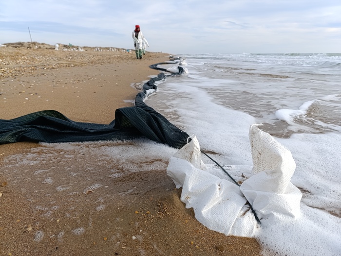 Технология рабочая. Мазут реально наполняется в сетях. Остается лишь вопрос как закрепить сеть. Сегодня попробовали прикрепить к мешкам с песком.