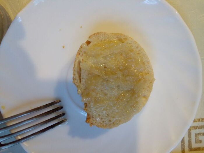 • обмазываем нижнюю полубулку любым соусом. Очень в меру обмазываем. Сюда очень хорошо подошёл бы луковый мармелад, но готовить ещё и его мне было слишком уж лень, поэтому здесь я намазал булку пробитым в блендере сливочным сыром с жареным луком и грибами);