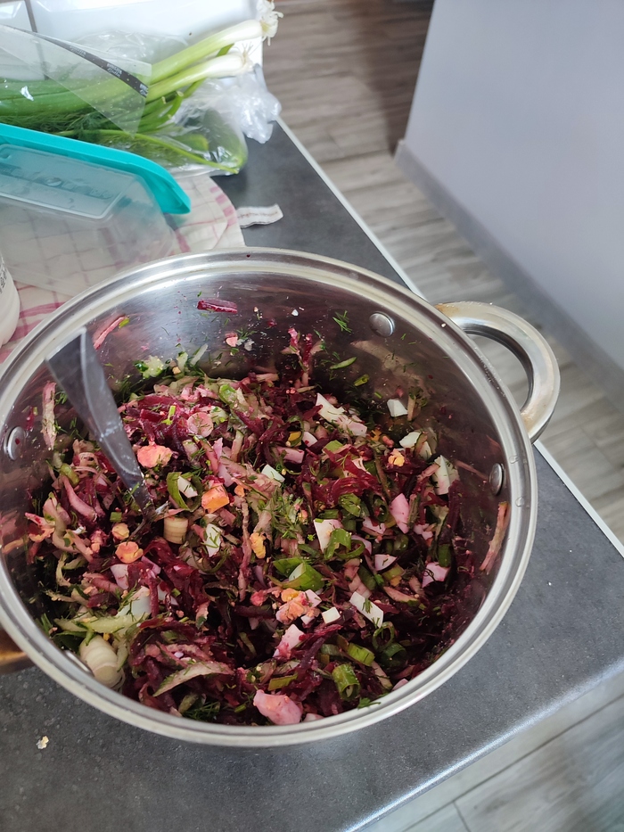 Далее бурак или свекла. Я купил готовую в пакете так как она долго вариться и соки все сохраняются. 2 средних свеклы тру на крупной тёрке.