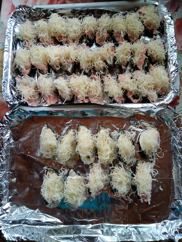 3. Выложил всё в мидии. Не хватило мне этой смеси, которую я делал, поэтому часть мидий была с домашней сметаной.
