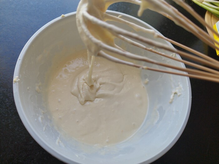2. Хорошенько перемешиваем, тесто должно быть как сметана. Можно добавить соль по вкусу.