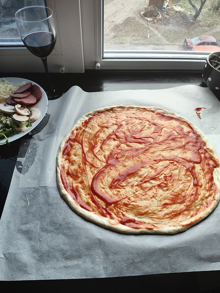 2. Из теста формируем форму теста без скалки, руками (руки можно смазать маслом что бы не прилипало тесто). Для этого кладем шарик на пергамент слегка смазанный маслом и из центра до краев растягиваем тесто, тесто должно быть мягким не рваться и не быть резиновым. Таким образом очень легко сформировать круглую, тонкую форму как на фото.