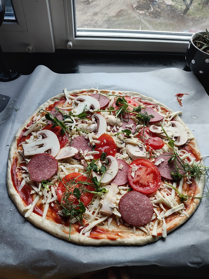 4. Выкладываем наполнение. В моем случае это грибы, колбаса и помидоры, важно на самый них выкладывать сыр, я использую сулугуни он более соленый, можно моцареллу, еще мне очень нравится если добавить творог - это придаст классный сливочный вкус но не много примерно 30% от основного сыра иначе будет много жидкости.