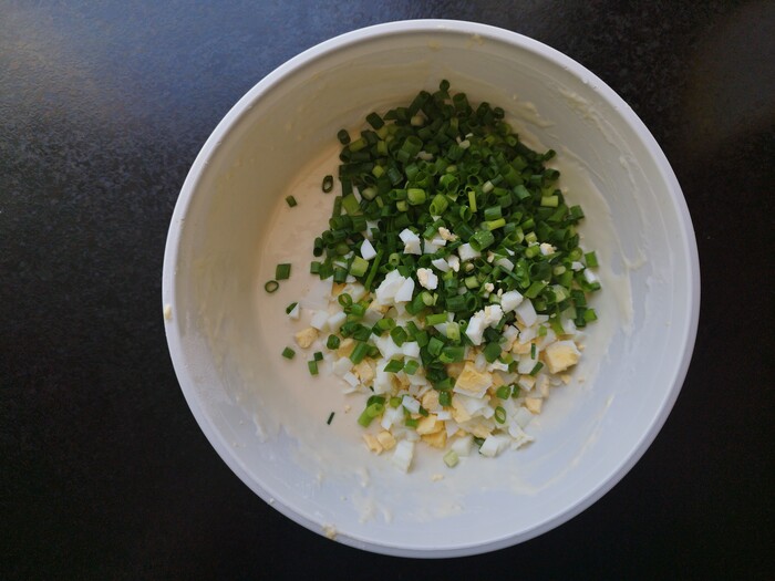 3. Варим яйца. Мелко режем лук и 2 свареных вкрутую яйца. Соединяем с тестом и перемешиваем.