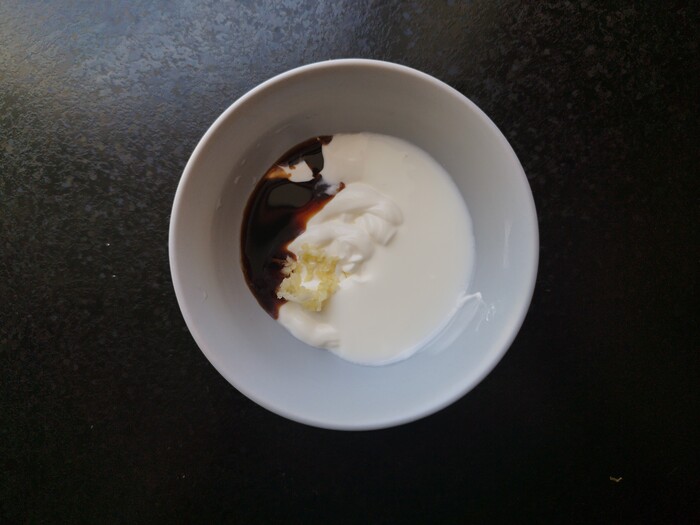 5. Делаем соус: в мисочке смешиваем пару ложек сметаны, грам 30-50 кефира, 1 натертый зубчик чеснока и ст.ложку соевого соуса.