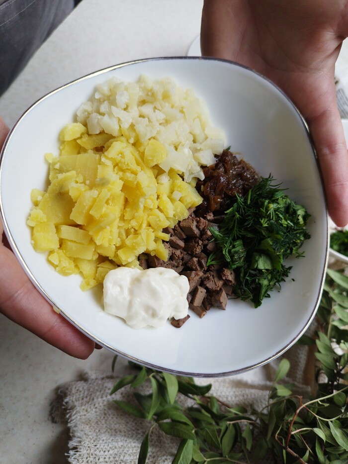 НАЧИНКА НОМЕР 1 - Лук мелко нарезать, обжарить с печенью на капле растительного масла. - Картофель сварить в мундире, почистить и мелко нарезать. - Добавить рубленую зелень и половинку отваренного и мелко нарезанного соцветия капусты. - майонез, соль, перец.