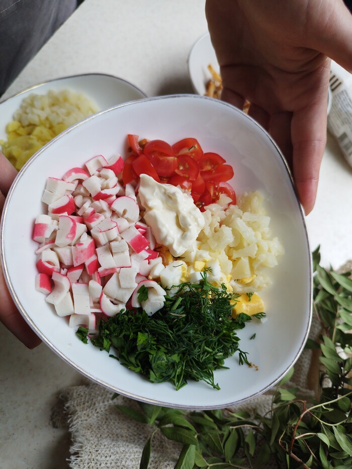 НАЧИНКА НОМЕР 2 - яйцо отварить и мелко нарезать - крабовые палочки и томаты так же мелко нарезать - добавить половинку отваренного и нарезанного соцветия цветной капусты, зелень - соль, перец, майонез