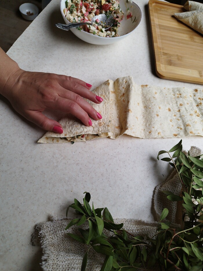 Теперь заворачиваем конвертики) 1. Режем лаваш на ленты по 10 см шириной