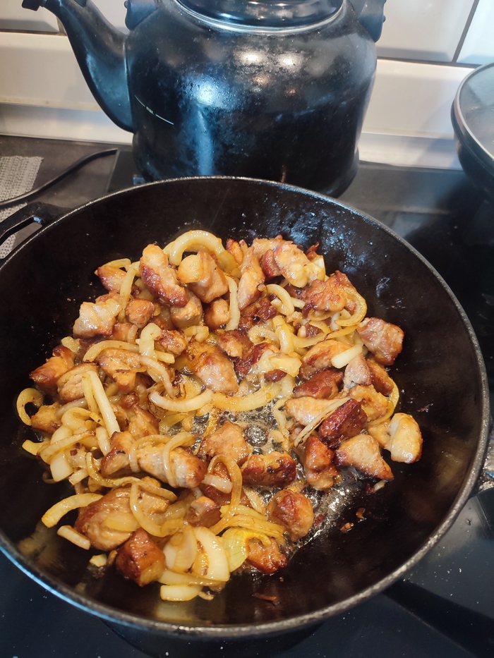 Итак все готово. Начинаю готовить. Мясо уже было нарезано и заморожено и это первый минус так как я бы порезал его крупнее. Ну да ладно. Беру свою чугунивую сковородку. Наливаю немного масла и начинаю нагревать.