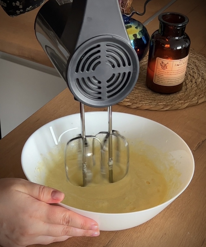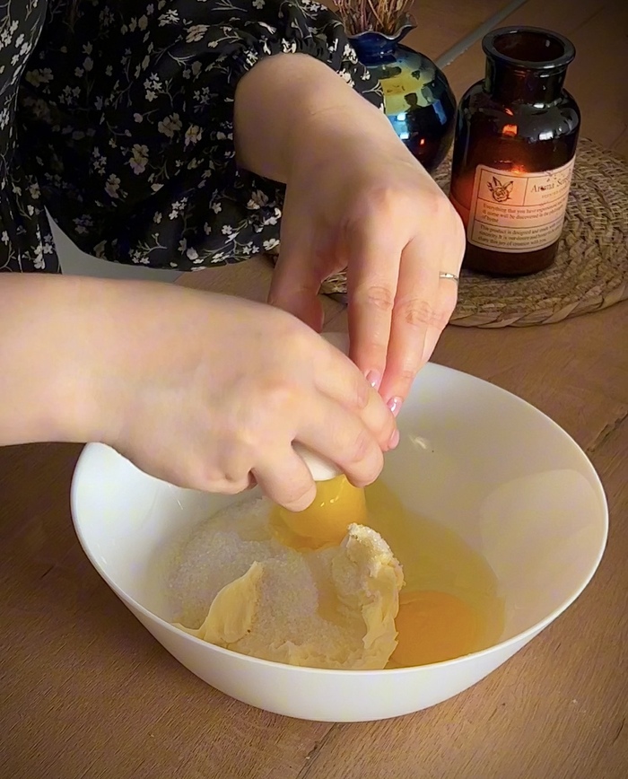 1. Смешиваем миксером мягкое масло, сахар и яйца.