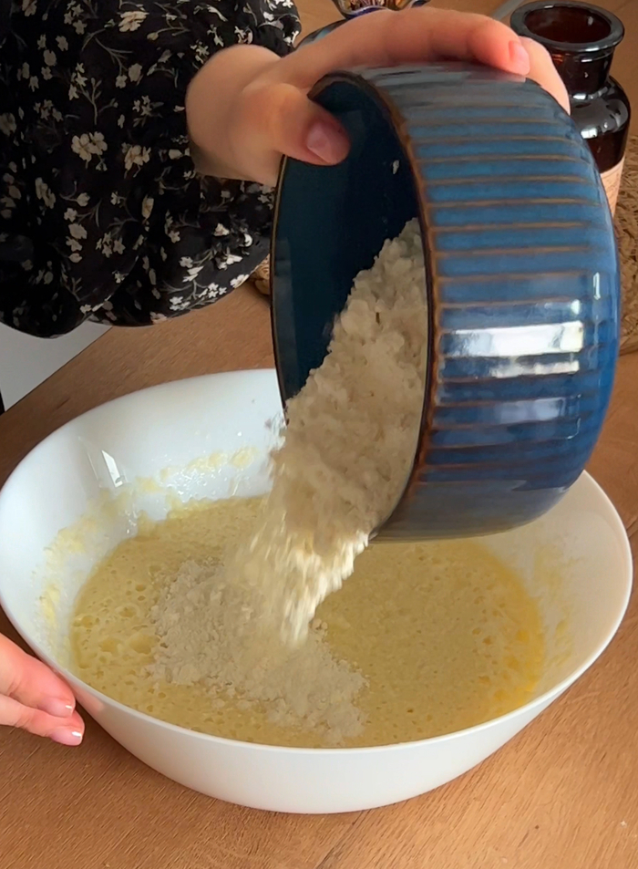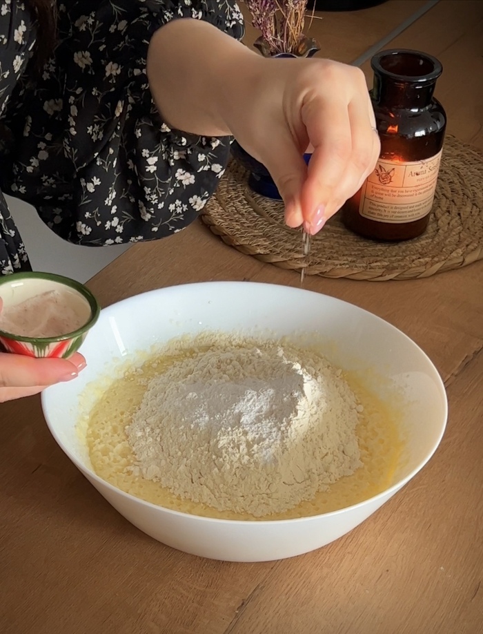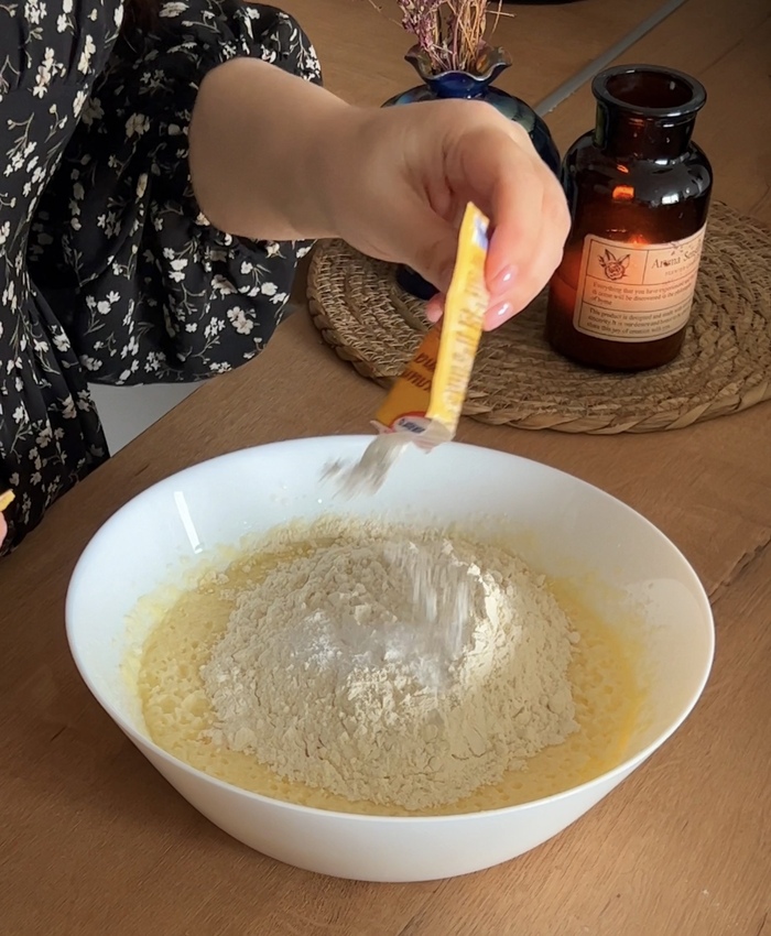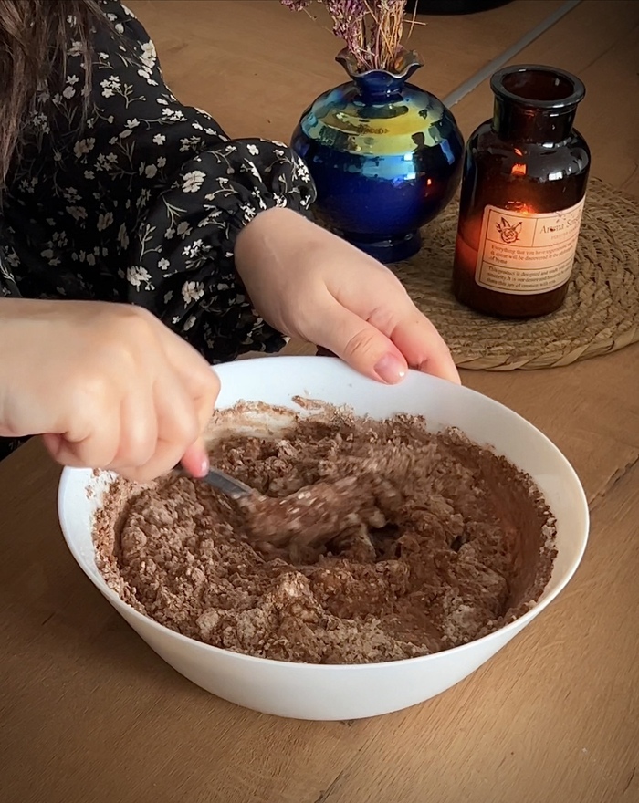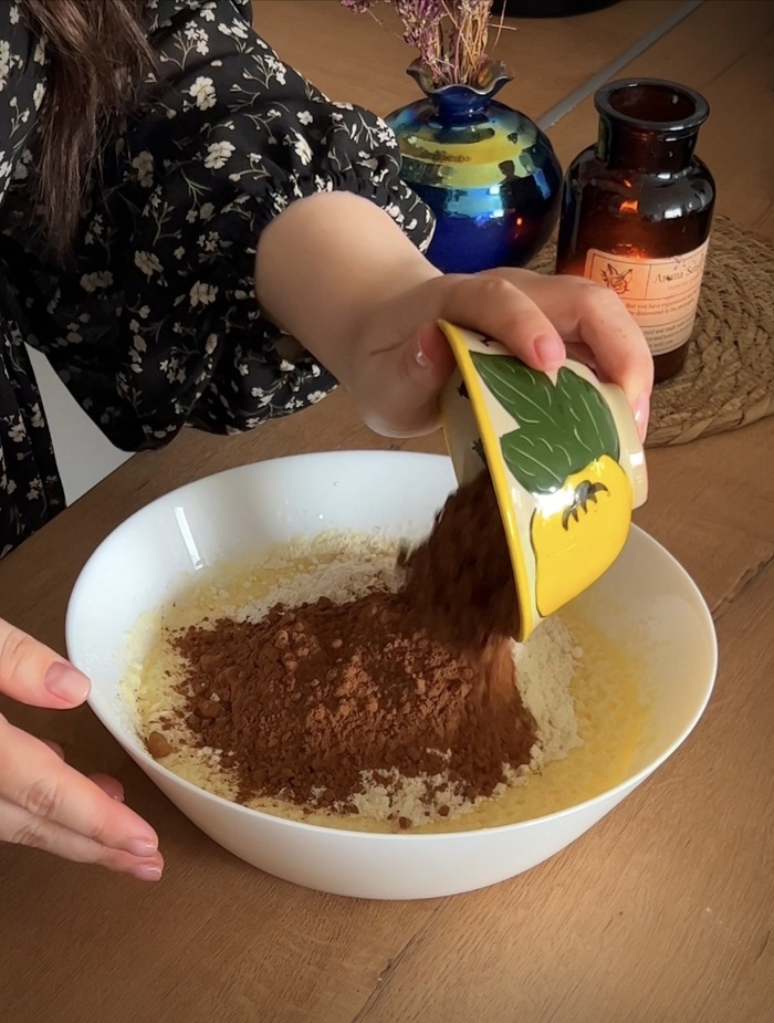 3. Высыпаем муку, разрыхлитель, соль, какао и перемешиваем до однородного состояния.