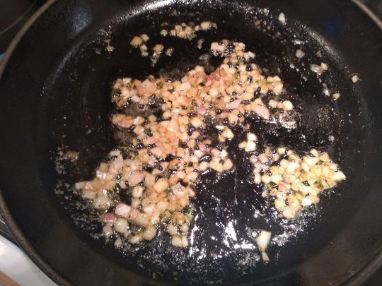 Оставьте масло, используемое для приготовления пищи, в отдельной миске на будущее. Затем вытрите сковороду. После растопите сливочное масло в сковороде на средне-слабом огне. Добавьте лук-шалот, тимьян, посолите и готовьте, постоянно помешивая, пока лук-шалот не станет мягким – около 1 минуты.