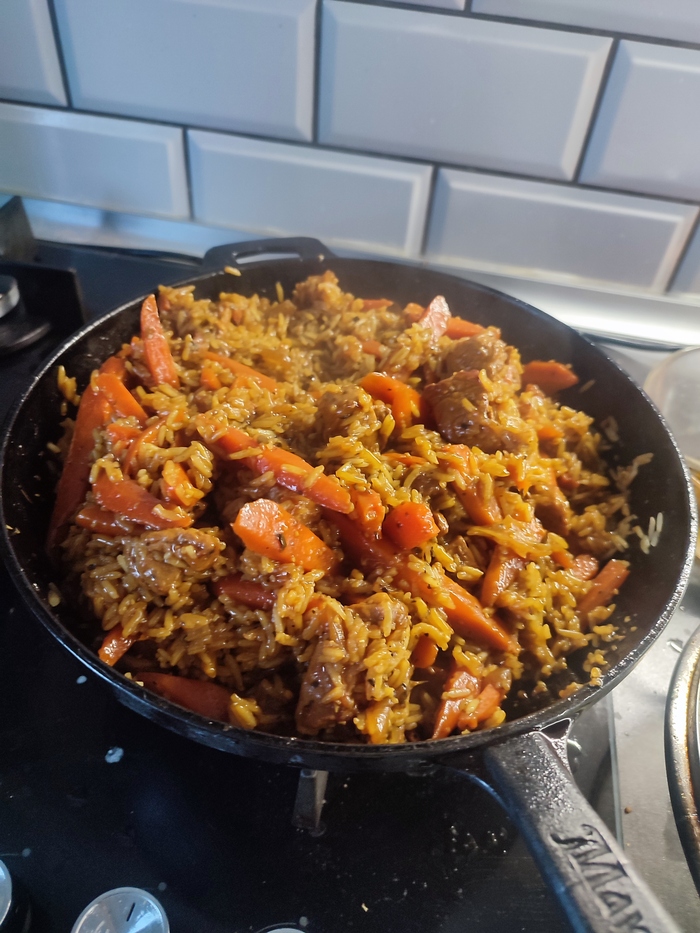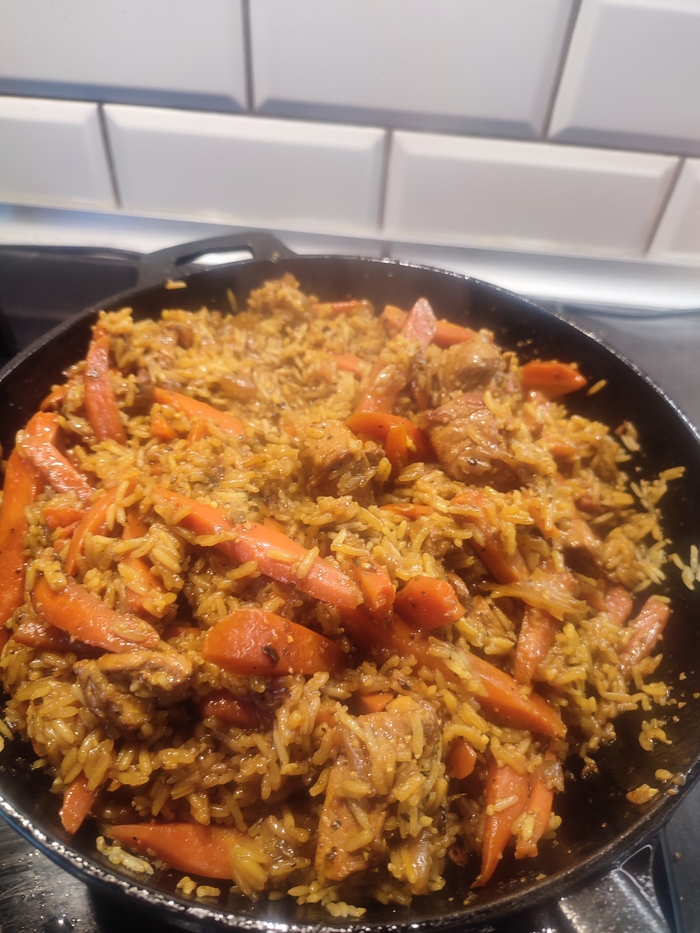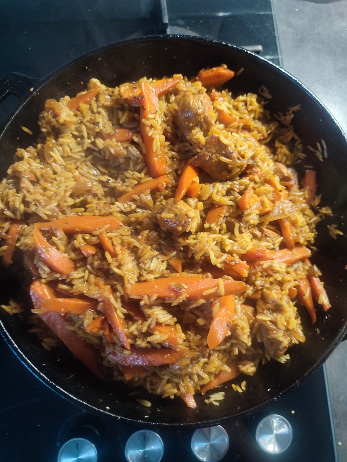 попробовал на вкус вроде нормальный плов. Ароматный. Рис сварился прекрасно. Да знаю что хорошо добавить изюм нут но нету.