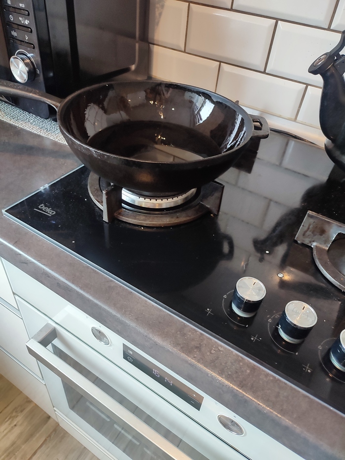Из Беларуси я привез чугунивою сковороду. Налил туда масла. Максимальный огонь и грею масло