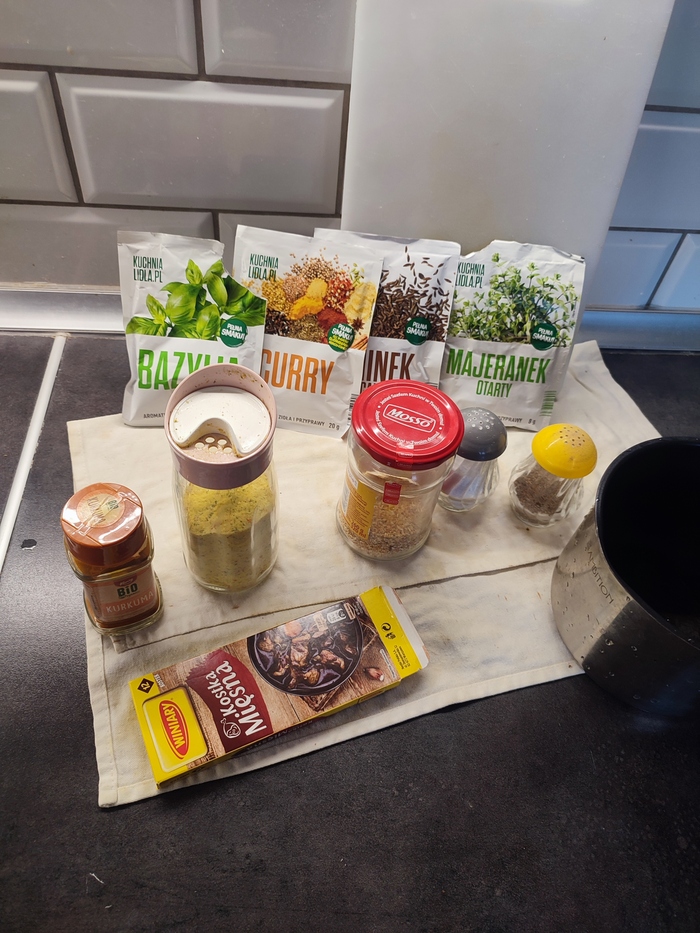 Соль перец. Универсальную приправу. Базилик. карри.бульонный кубик.вместо зиры пошел тмин. Надеюсь это одно и тоже. Так же добавил сладкой паприки.