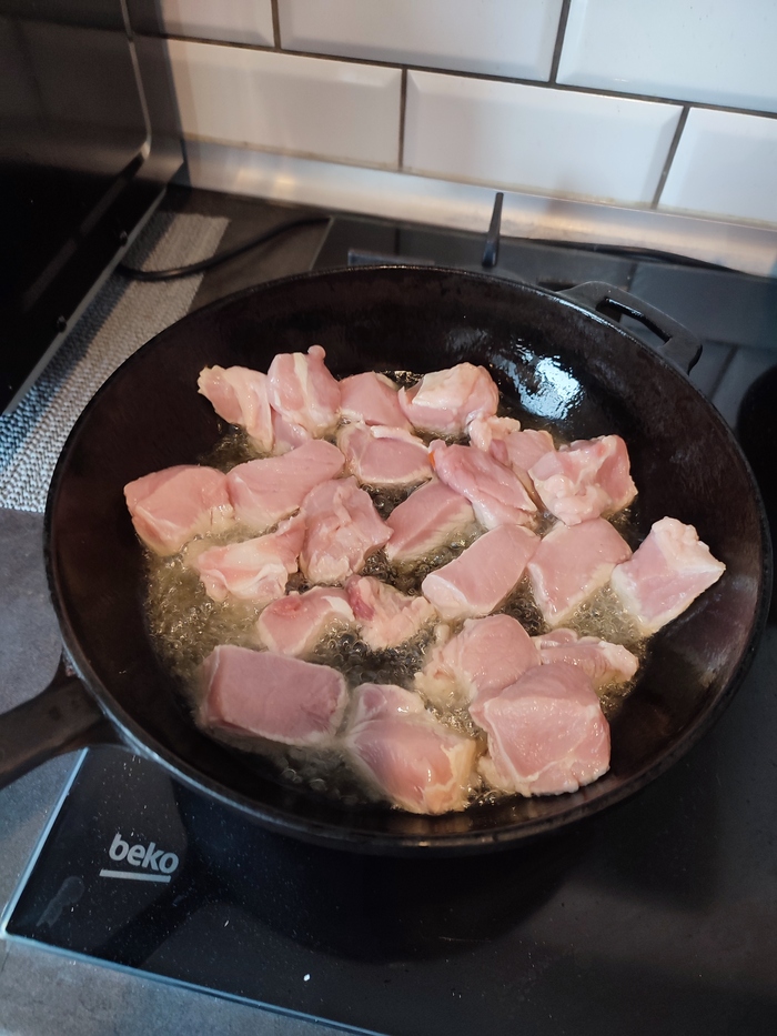 Мясо начинаю забрасывать в сковородку. Забрасываю по кусочку чтобы температура не падала. И не трогаю его несколько минут.