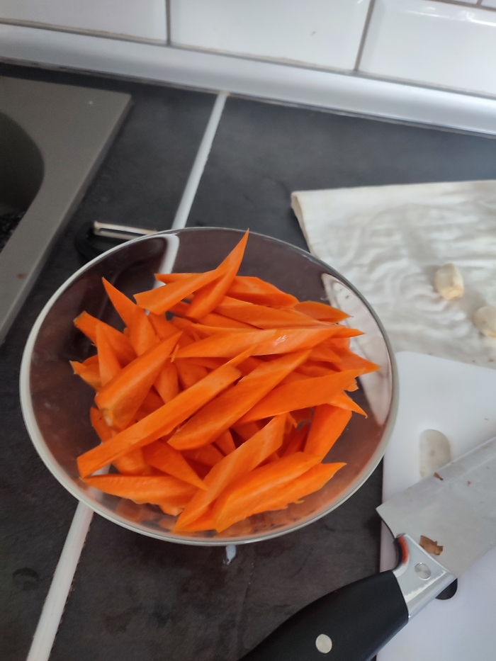 Морковку режу на ломтики. Так как слышал что на тёрке нельзя тереть в плов.