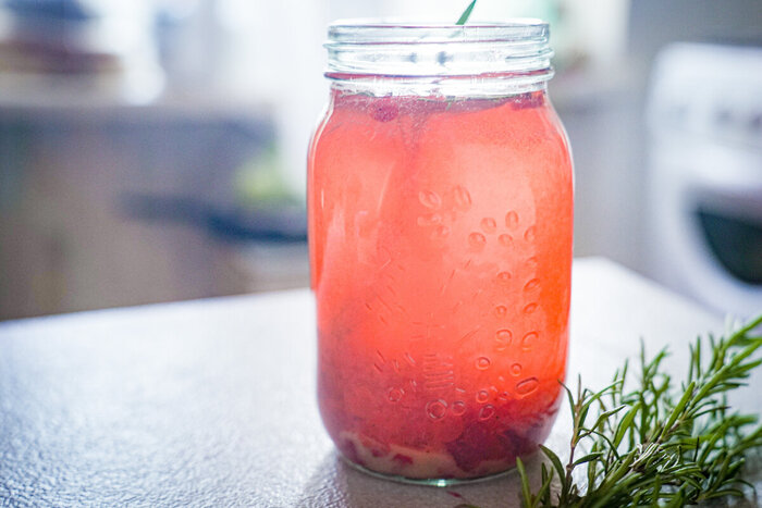 Туда же пару веточек розмарина размять. Всё это залить водой, по вкусу добавить мёд и столовую ложку рассола от квашеных томатов.