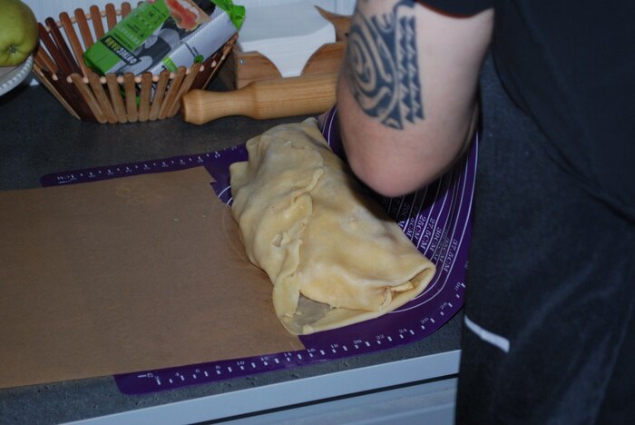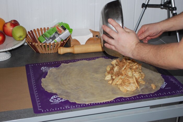 Ленивый яблочный штрудель из лаваша.Лаваш смажьте сливочным маслом, посыпьте крошкой из печенья. Выложите начинку, скатайте рулет, смажьте яйцом взбитым с молоком и в духовку до образования корочки. Температура 180 градусов.