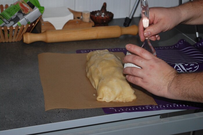 одно сырое яйцо взбиваем с одной ст. ложкой воды и этой смесью промазываем края теста.