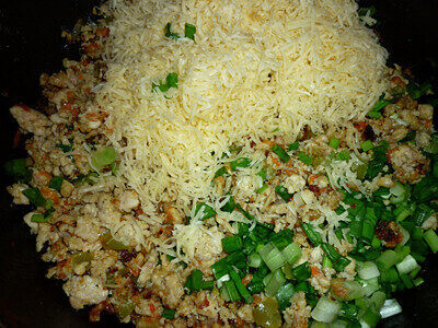 Дадим фаршу остыть и смешиваем с тертым на мелкой терке сыром, порубленным зеленым луком. Получилась начинка для пирога.