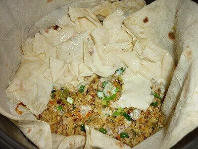 Первый лист лаваша кладем в смазанную маслом форму для запекания, промазываем смесью ( смеси не жалеем, от этого зависит сочность нашей ачмы ) и выкладываем начинку, закрываем начинку свободными концами лаваша, опять промазываем лаваш смесью. Когда все листы лаваша уложены подобным образом, остатки смеси выливаем сверху.