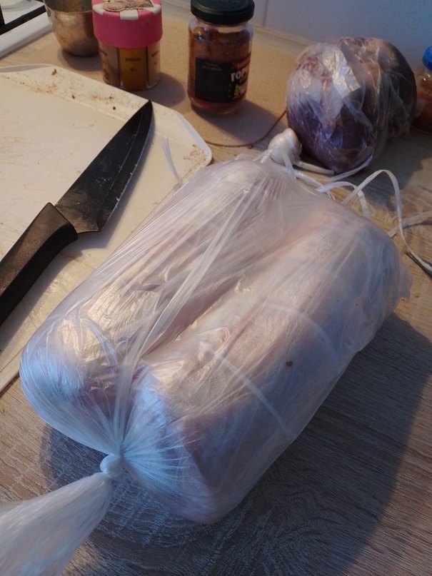 Перевязать ниткой (ход через 2-3 см) сложить в три пакета и ещё раз перевязать для исключения попадания воды, варить 2 часа, вынуть из пакета, оставить в пленке и под пресс остужать на балкон или в холодильник часов 5.