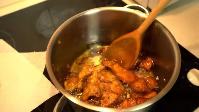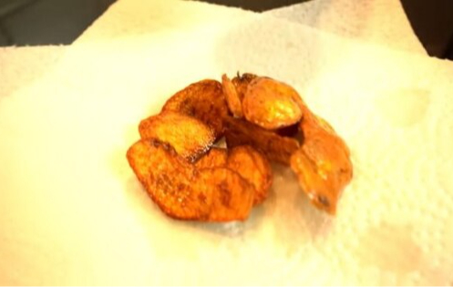 4) Выкладываем нашу кожуру в кастрюлю и начинаем жарить примерно минут 6 где то. Когда будут готовы нужно выложить на бумажное полотенце что бы лишнее масло ушло.