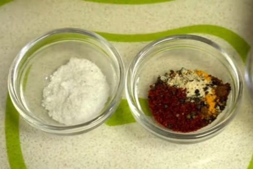 3) Пока масло нагревается подготовим специи для наших чипсов, у нас соль, перец паприка, чеснок свежий и куркума(можно сухой чеснок кстати) все это лучше перемещать в одну емкость, аккуратней с куркумой ее совсем чуть чуть нужно. Вы же можете добавить приправу по своему вкусу.