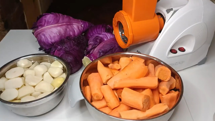 Возьму свою мясорубку и перетру морковь на ней, а также нарежу капусту для салата. Затем приступлю к подготовке остальных овощей.