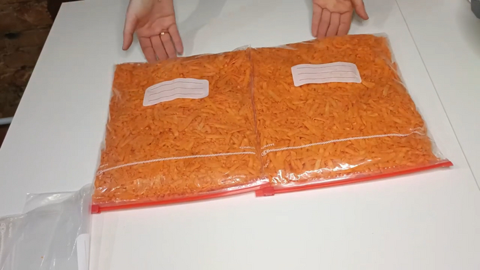 Для заморозки я равномерно распределяю морковь по пакету, удаляю воздух и закрываю клапан. Затем перехожу ко второму пакету, делаю то же самое и замораживаю. Таким образом я сэкономила время, так как уже имею готовую натертую морковь на будущие блюда.