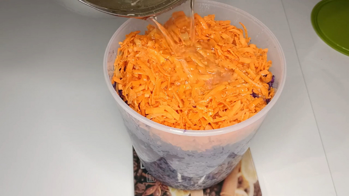 Я сегодня пожалела, что не надела перчатки, так как мои руки уже окрасились от морковки и капусты. Но делать уже нечего, перехожу к нарезке капусты. Это краснокочанная капуста, которая выросла на моем участке. Приятно использовать в готовке продукты, в качестве которых ты уверен, ведь вырастила их я сама.