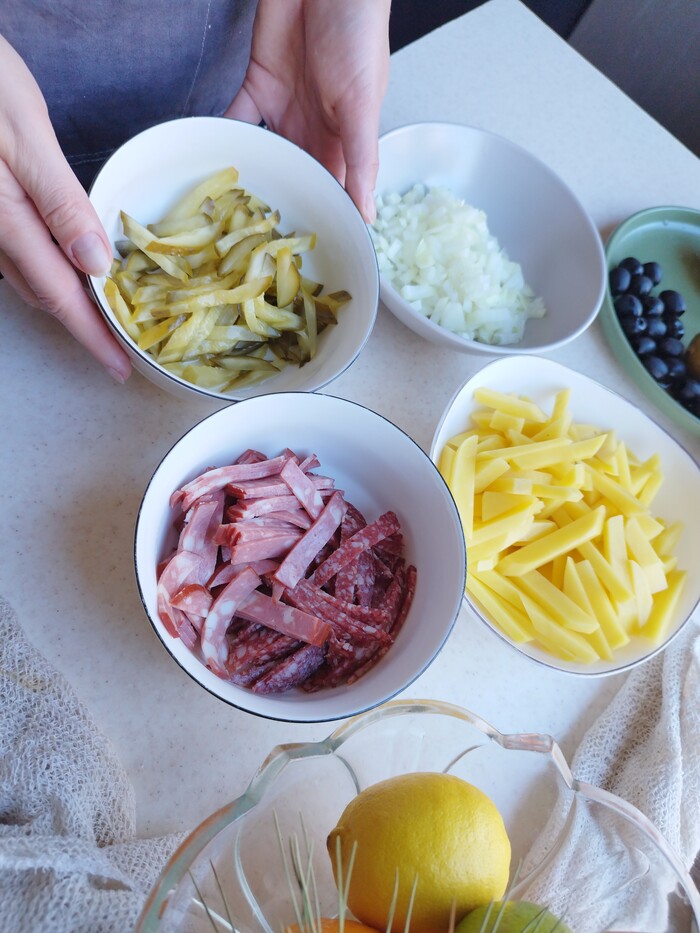 2. Пока ножка варится - у нас есть возможность не терять время и нарезать остальные продукты. Мне нравится резать огурцы, колбасы и картофель брусочками. А лук - мелко.
