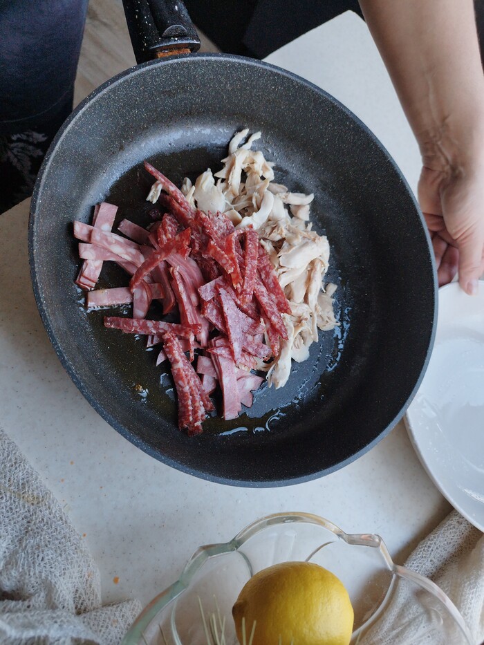 7. Разбираем куриное мясо и быстренько обжариваем с колбасой.
