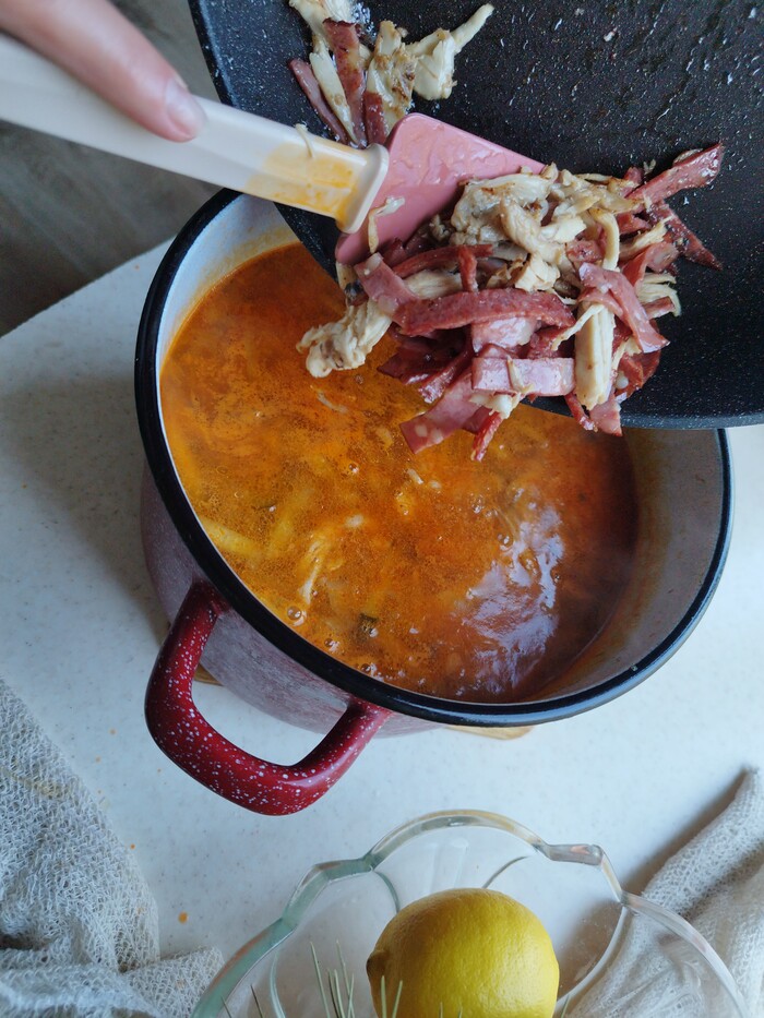 По всем правилам в этом супе должна быть говядина, какие нибудь ребрышки и куча копченостей. Но, не в моем случае. Будем готовить из того, что позволяет кошелек. А мой кошелек вроде позволяет, но тут придется сделать выбор между супом и очередной коммуналкой. Ну, посмотрим, что из этой затеи выйдет)