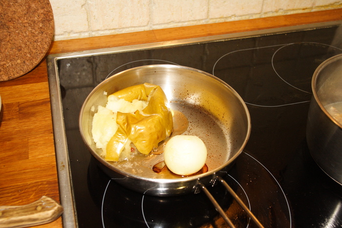 Водо-спирто (отдельная кастрюля/сковородка): красное вино наливаем, сыплем корицу, гвоздику, имбирь, мускатный орех, кардамон (тут что есть в доме — исходя из того, что Вы бы насыпали в выпечку или глинтвейн, сумах или зира , к примеру не в тему, как мне кажется), нам не надо активного кипения