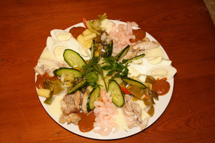 - в рецепт включены мясные, рыбные и овощные закуски (рябчики, язык, раковые шейки, пикули и пр.) и соусы для макания