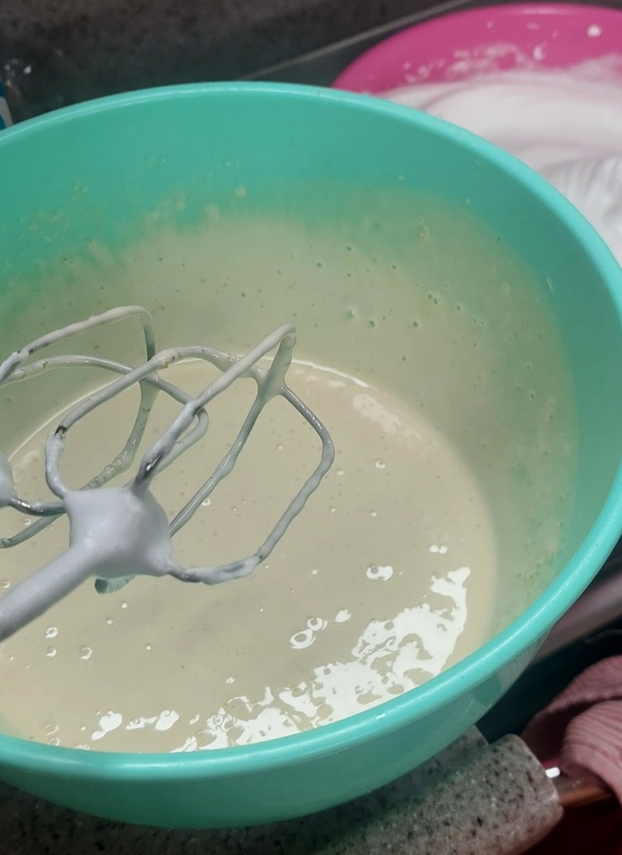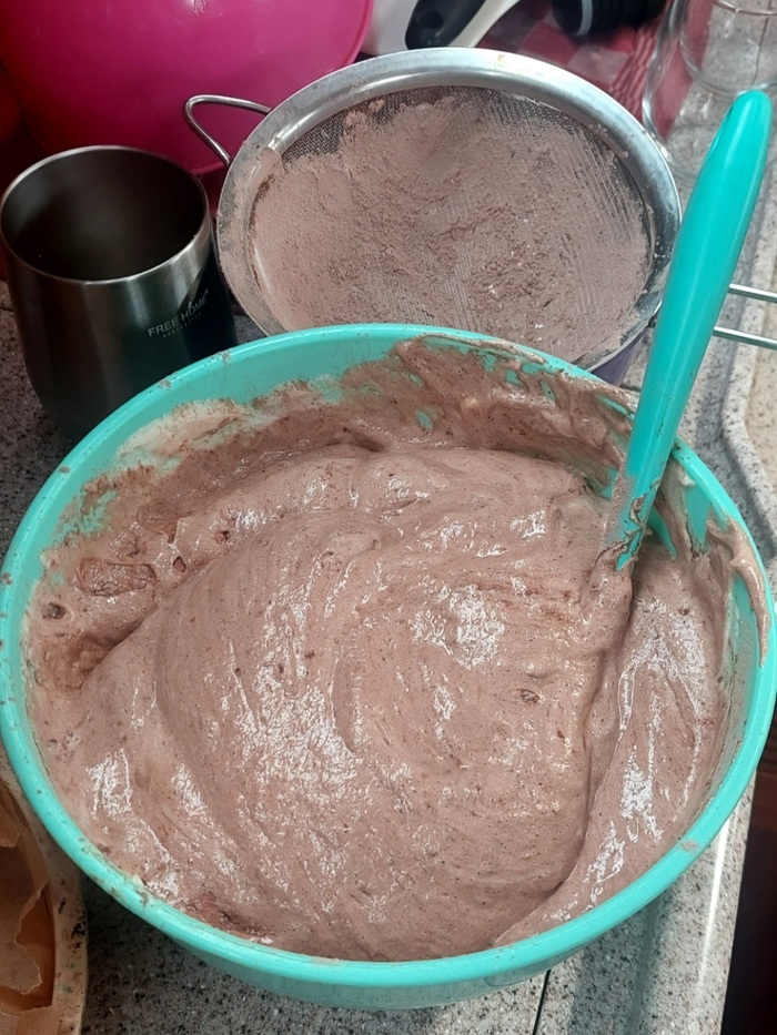 Далее по стандартной схеме, белки с 2/3 сахара в пену, яйца с сахаром до белого цвета, добпвляем в белки, сухие ингредиенты смешиваем и через сито постепенно добавляем к яйцовой смеси.