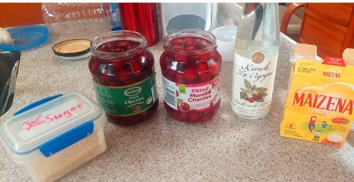 Сахар 2 ст ложки, вишня 2 банки, вишнёвый шнапс, крахмал