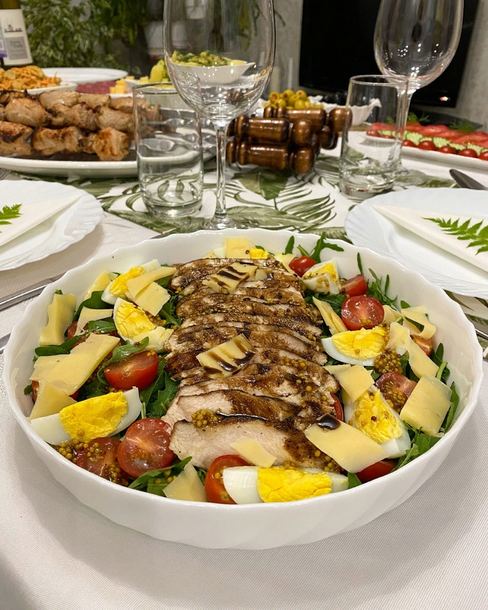 На листья салата и руколы выложить мясо, порезанные кусочками или дольками помидоры и отварные яйца. Сверху полить заправкой и подавать.