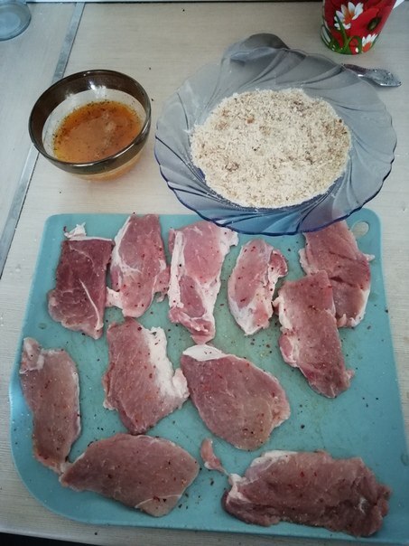 • Мясо отбиваем не сильно тонко и оставляем. Если мясо жёсткое нужно замочить минут на 10 в горчице, разведенной водой.